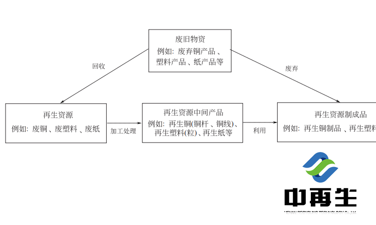 再生資源是指來源于社會生產(chǎn)和生活消費過程的各類廢棄物,經(jīng)過回收、加工和利用等環(huán)節(jié),可以重新獲得使用價值的物質(zhì)。此外,對符合國家環(huán)??刂茦?biāo)準(zhǔn)的進(jìn)口可用作原料的固體廢物也是中國再生資源的一個重要來源。需要注意的是,再生資源與再生資源產(chǎn)品的概念有區(qū)別。例如再生銅、再生鋁、再生塑料等概念是指廢舊銅、鋁和塑料經(jīng)過回收、分揀、熔煉、拉絲造粒等環(huán)節(jié)加工而成的中間再生資源產(chǎn)品,為制造企業(yè)深加工得到再生資源的制成品提供原料,如圖所示: