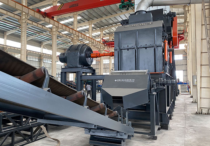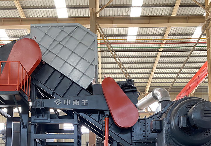 破碎線主機殼體采用特厚鋼板制造,內(nèi)襯為高錳鑄鋼件,可更換;主機轉(zhuǎn)子盤安裝于水平軸上,轉(zhuǎn)子盤圓周分布有銷軸,軸向懸有錘頭;主軸用滾珠軸承支撐,循環(huán)油強制潤滑冷卻,并裝有溫度傳感器;進料口裝有液壓輥筒喂料裝置,位置一高一低,同向旋轉(zhuǎn),能將大件松散物料壓扁,送入破碎腔內(nèi)。